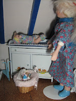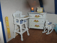 vader is bezig met zijn hobby. De dekenkist voor het bed heb ik gemaakt op een poppenhuis workshop waar de deelnemers geleerd werd, houten voorwerpen te beplakken met de eerste laag van servetten (net zoals de dakpannen van jaren geleden). Dit kun je toepassen op alle onbeschilderde meubeltjes van Euro mini’s bijvoorbeeld. Een heel leuk maar erg secuur werkje.In de babykamer slapen twee baby’s. Eén daarvan is momenteel even bij oma. Met plaatjes uit een P & M krijgen de meubeltje een hele leuke uitstraling. Het ladenkastje, de schommelwieg en de commode zijn naar tekening uit diezelfde P & M gemaakt.Het kinderlampje is ook heel simpel zelf te maken. Een doorzichtig papiertje, een leuk plaatje erop, een geschilderd houten rondje met daarin een lampje bevestigd en klaar is Kees.