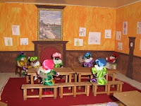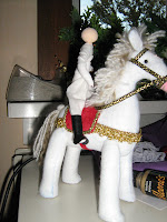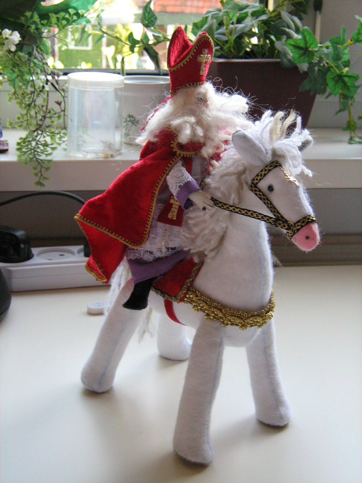We (het knutselclubje) werkten samen met een aantal vrijwilligsters op de school. Wij bereidden alles voor en zij hielpen mee het uit te werken. De Pietjes, een stuk of 80 maar, werden van chenilledraad in elkaar gezet, van hoofdjes voorzien, geschilderd, beplakt met haren en door ons aangekleed. Voor de pakjes van de Pieten, hebben we op het breedste lint wat te krijgen was, een bepaald model met de naaimachine gezigzagd, uitgeknipt en tot pakjes genaaid en afgewerkt met lint van 3 mm. De vrijwilligsters hadden heeeeeel veel handjes en voetjes van vilt geknipt, zodat de Pietjes handschoentjes en schoenen aankonden.