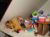 Alle spullen op tafels in een lokaal, want hier zijn we aan de slag gegaan met het poppenhuis in te richten.