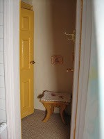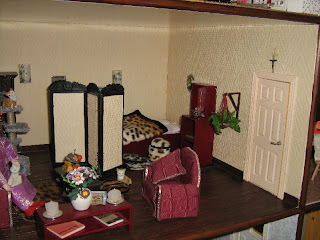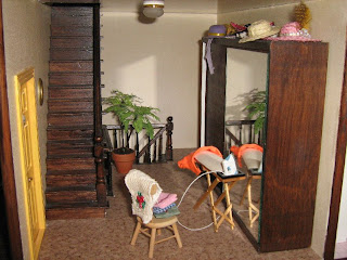 Vandaag de foto’s van de 2e verdieping. Wederom van links naar rechts: De kamer van de vrijgezelle tante. Het slaapkamergedeelte is gemaakt naar het voorbeeld uit de Poppenhuis & Miniaturen nr. 70.