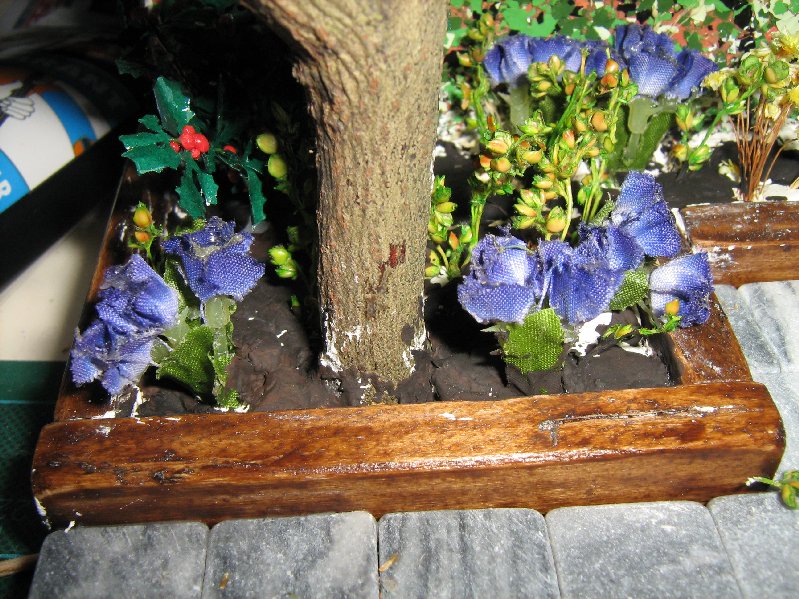 Aan het tuintje zijn wat plantjes toegevoegd. Zoals een kleine vuurdoorn in de hoek. Helemaal links van de boom staat een klein hulststruikje en de rest zijn wat fantasie plantjes.