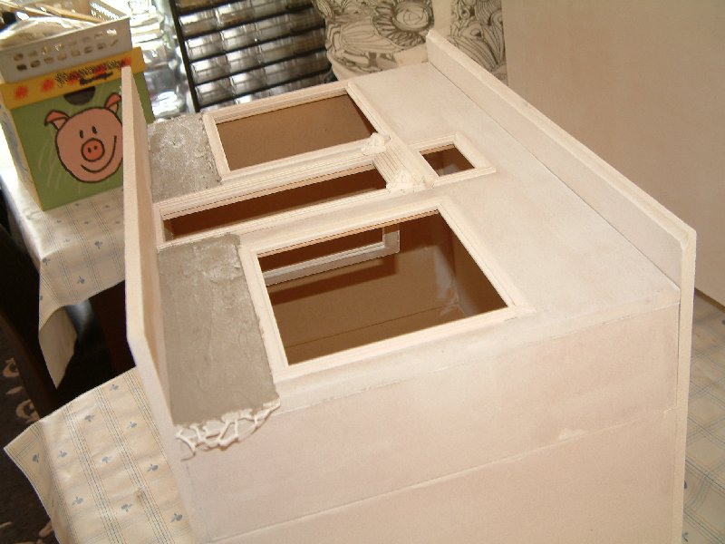 Kopjes onder de dakrand geplakt en thuis verder gegaan met aflakken. Als inspiratie voor de kleuren van het geheel, heb ik een woonhuis bij mij in de buurt genomen.